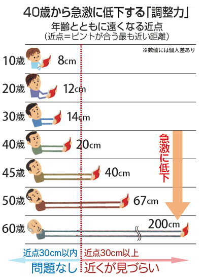 老眼になると、このピントを合わせられる距離の幅が狭くなってきます。